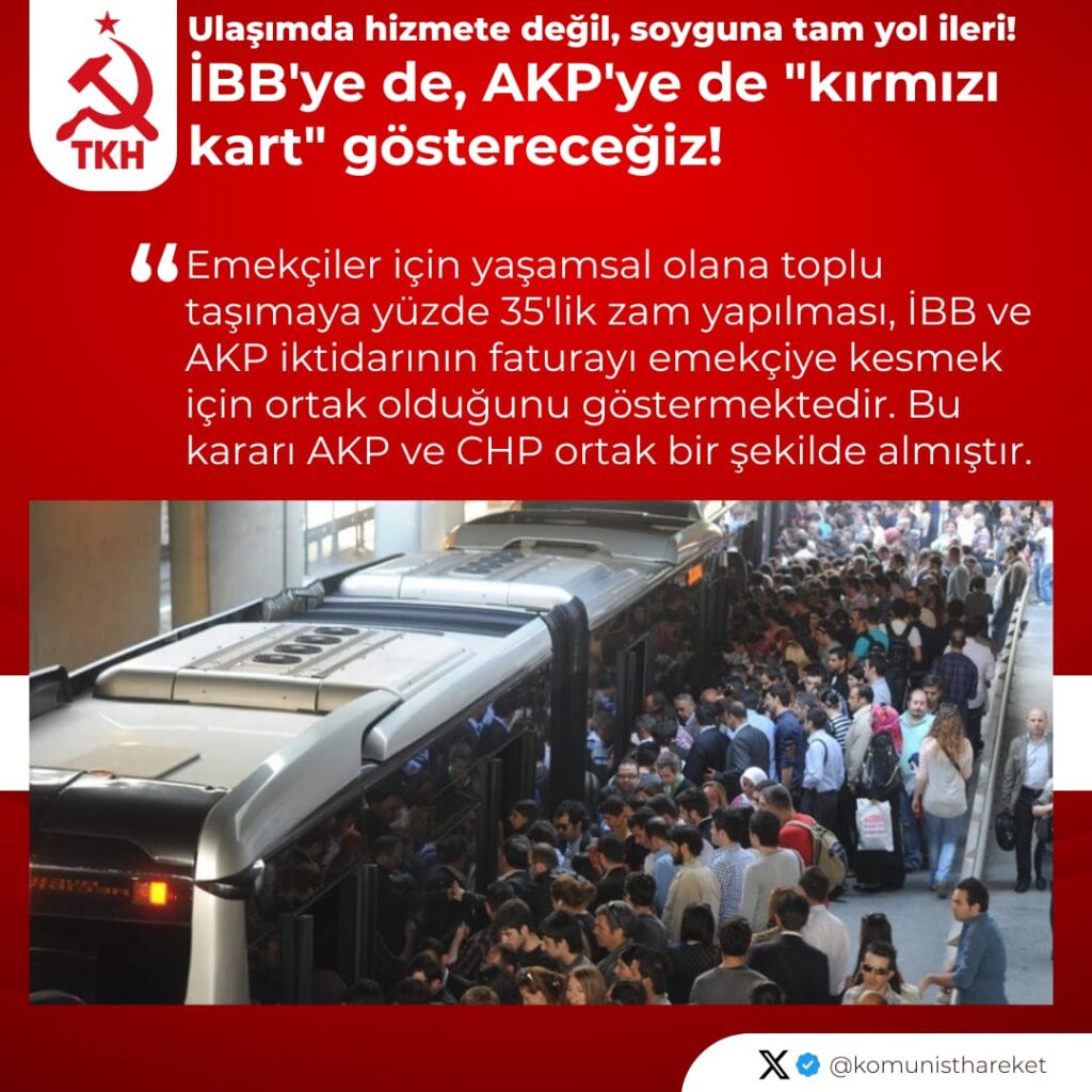 İstanbul Büyükşehir Belediyesi UKOME toplantısında toplu taşımaya bir kez daha “devasa” zam kararı aldı. 2025 yılı için belirlenen fiyatlara göre toplu taşımada yüzde 35’lik zam kararı alınırken, bu zamla birlikte tam bilet fiyatı 27 TL, tam abonman fiyatı ise 2118 TL oldu. Asgari ücrete yüzde 30, emekliye yüzde 15, memura yüzde 11 zam yapıldığı, bir ortamda emekçiler için yaşamsal olana toplu taşımaya yüzde 35’lik zam yapılması, İBB ve AKP iktidarının faturayı emekçiye kesmek için ortak olduğunu göstermektedir. Bu kararı AKP ve CHP ortak bir şekilde almıştır.