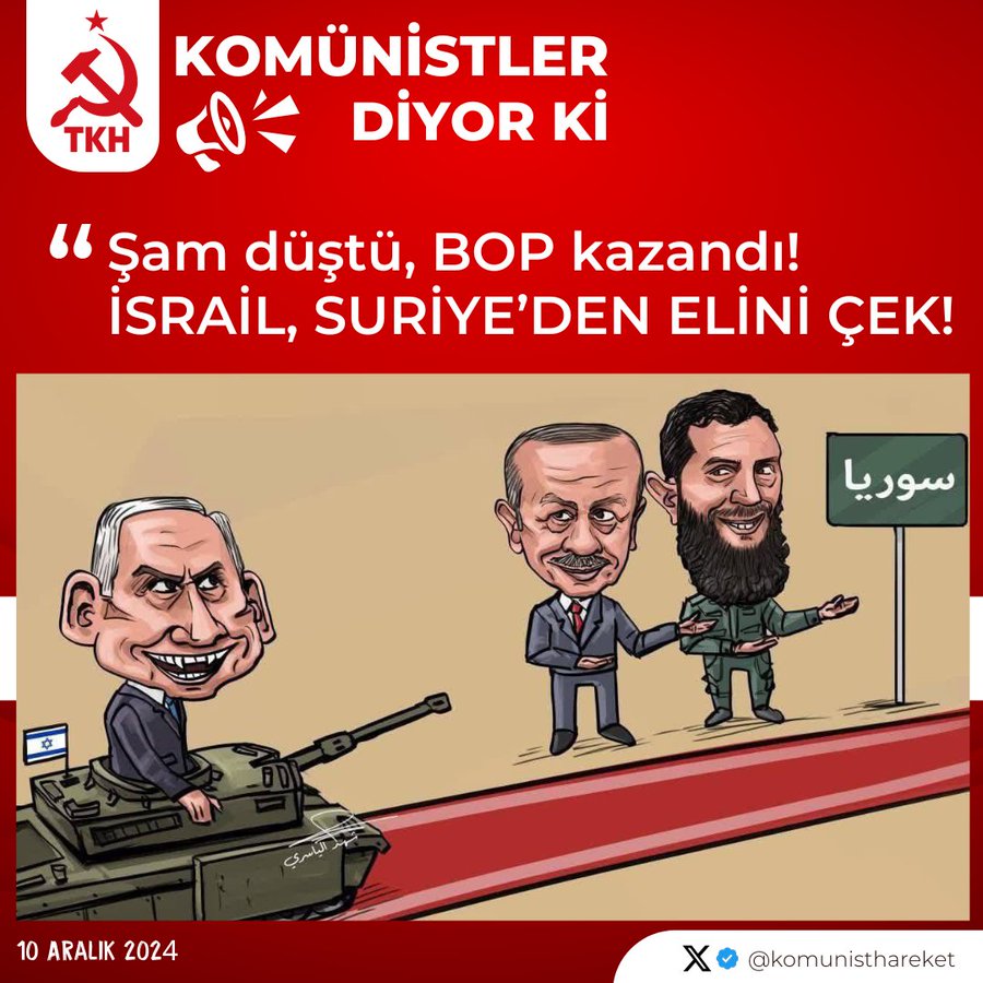 Baas’ın iktidardan düşmesini fırsat bilen İsrail, Suriye’ye büyük bir saldırı başlattı. İsrail tarihinin en büyük hava saldırısı olarak kayıtlara geçen saldırıda Suriye’de 250 hedef vuruldu. Gazze’yi yerle bir eden siyonist İsrail yönetimi, Suriye’nin bütün altyapısını vururken aynı zamanda Suriye topraklarını işgal etmekten çekinmedi. El Kaide kökenli ve BM’ye göre terör örgütü sayılan HTŞ’nin kimlere hizmet ettiğini tarih yazacaktır. İsrail; işgal ettiğin Filistin’den olduğu gibi Suriye’den de elini çek! İsrail’in Suriye’ye yönelik saldırılarına hayır!