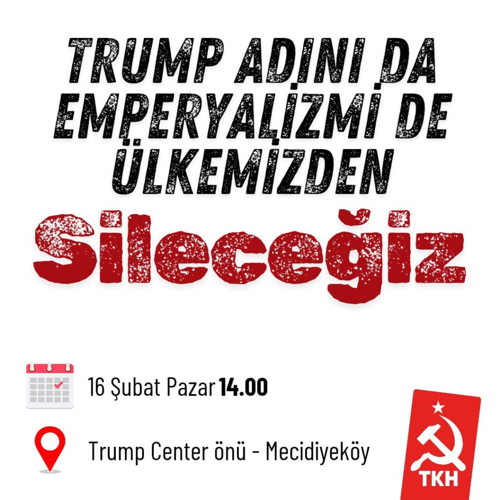 Filistin halkının zorunlu sürgününü ve Gazze’yi ilhakı savunan emperyalist ABD başkanı Trump’ın adı ülkemizde hiçbir yere verilemez. Partimiz Türkiye Komünist Hareketi 16 Şubat Pazar günü saat 14.00’da Trump Center önünde ABD emperyalizmi karşıtı bir basın açıklaması gerçekleştirecektir.